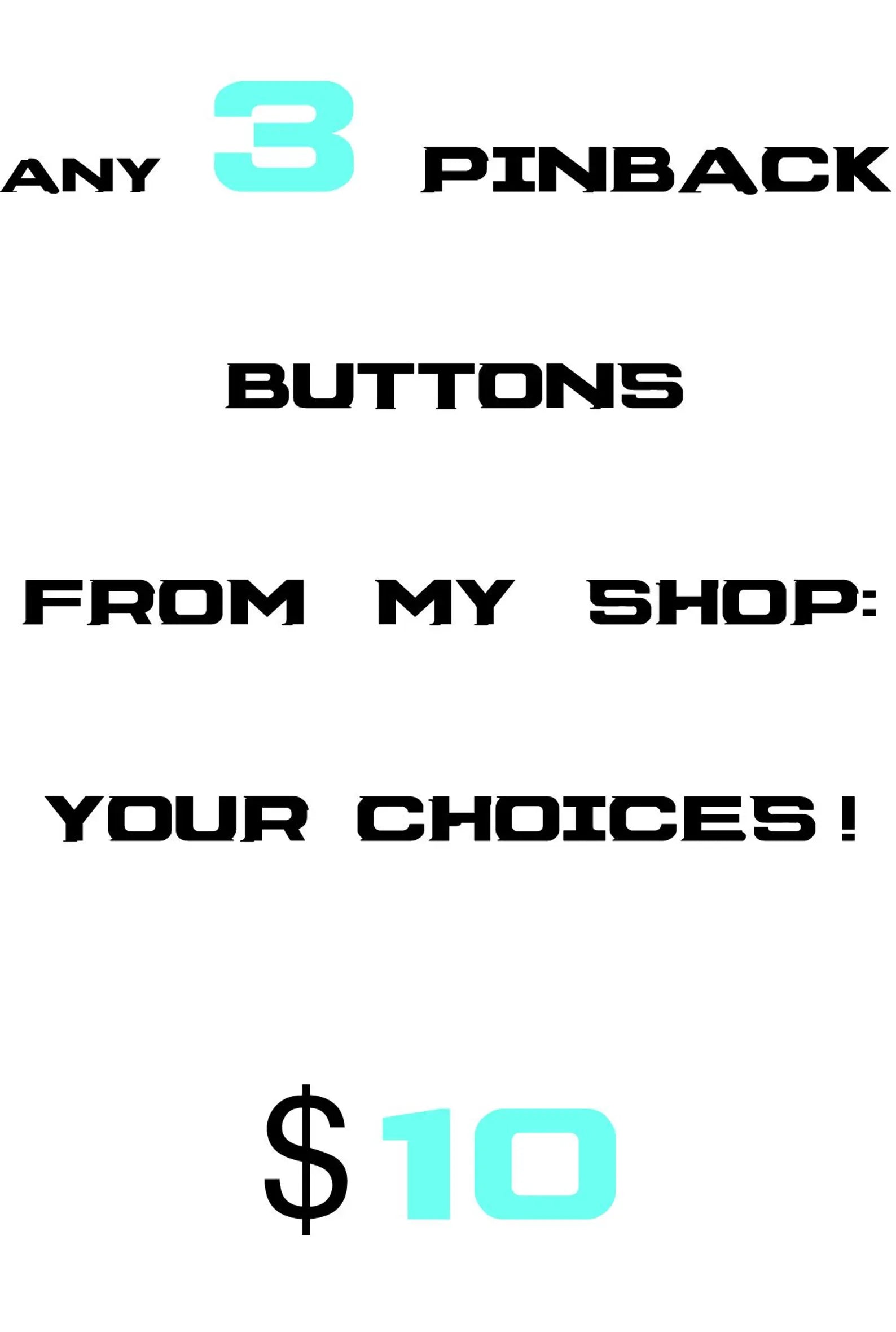 Choose 3 buttons and message the preferred buttons wanted. I cannot assume what you are wanting, and will not ship until you have chosen the buttons by messaging me.